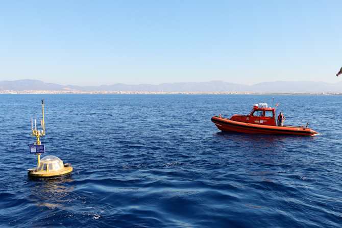 Como primer destino de campaña, el B/O SOCIB navegó hasta la Reserva Marina de Cap Endecorrat donde se encuentra instalada la boya oceanográfica con la que la ICTS SOCIB proporciona datos de la bahía de Palma. Allí, los jóvenes estudiantes participaron en una actividad fundamental para los oceanógrafos: la recogida de muestras de agua de mar. El buque oceanográfico es pieza clave en la ICTS SOCIB para realizar esta tarea ya que está equipado con una roseta. Los galardonados asistieron al lanzamiento al mar de este instrumento capaz de bajar a lo largo de la columna de agua y de recoger muestras de agua a diferentes profundidades.